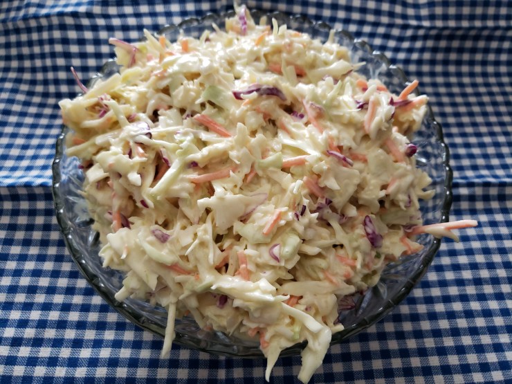Whisk together all ingredients except shredded cabbage until combined.  Pour over shredded cabbage and stir to coat.  Let stand several minutes and stir again.